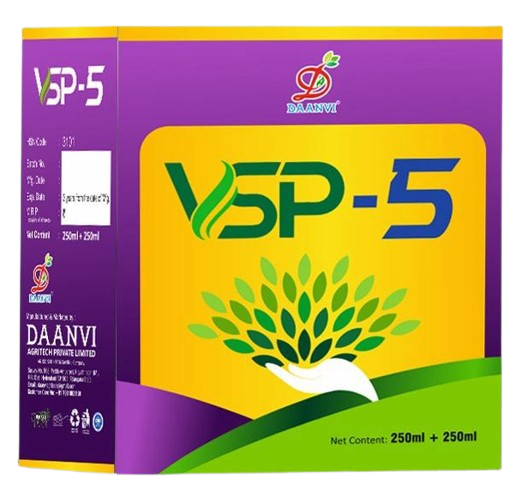 VSP-5 promotes profuse growth and development of primary and secondary root systems. It increases soil microbial activity, reduces flower and fruit dropping, and enhances photosynthetic efficiency. VSP-5 also improves plant strength against abiotic stress and helps develop resistance to pests and diseases.